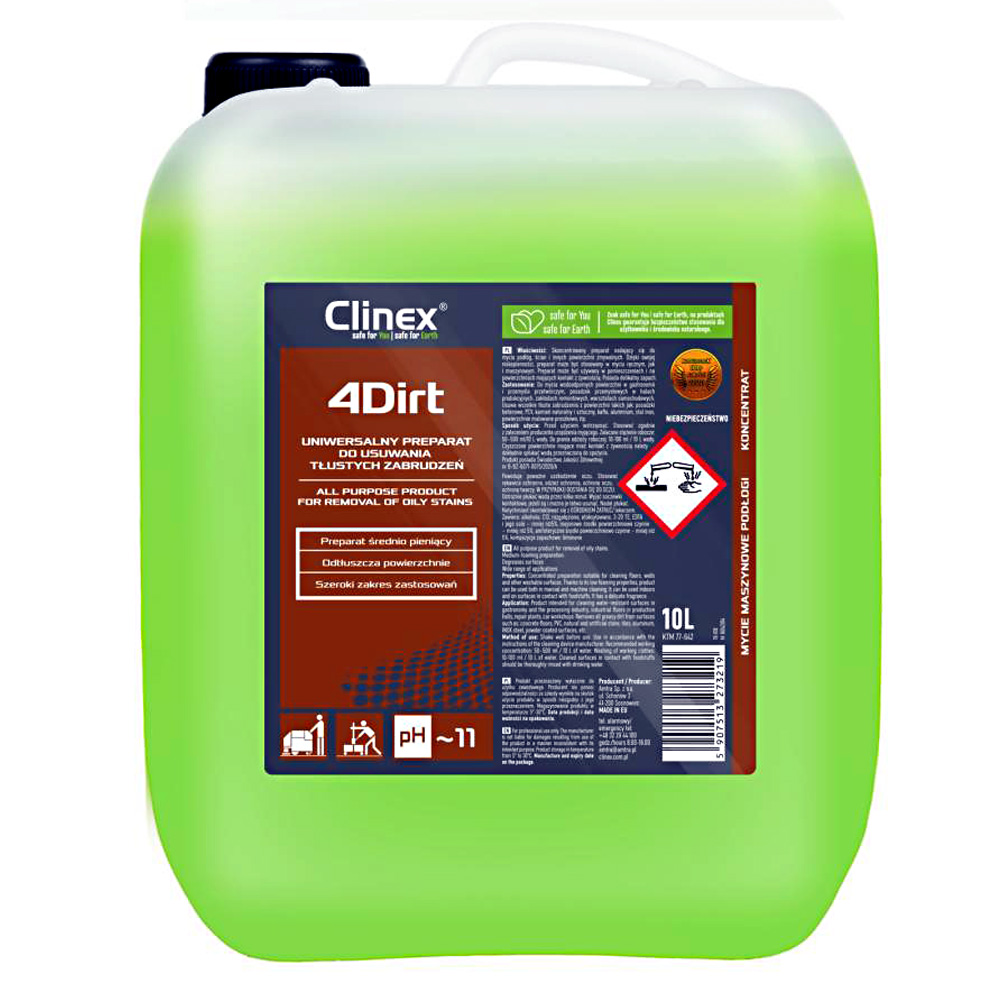 CLINEX 4DIRT je vysoce účinný, koncentrovaný čistič mastných nečistot, který snadno a efektivně odstraňuje i ty nejodolnější tuky a mastnotu z různých omyvatelných povrchů. Je vhodný pro ruční i strojní čištění v profesionálním i domácím prostředí.