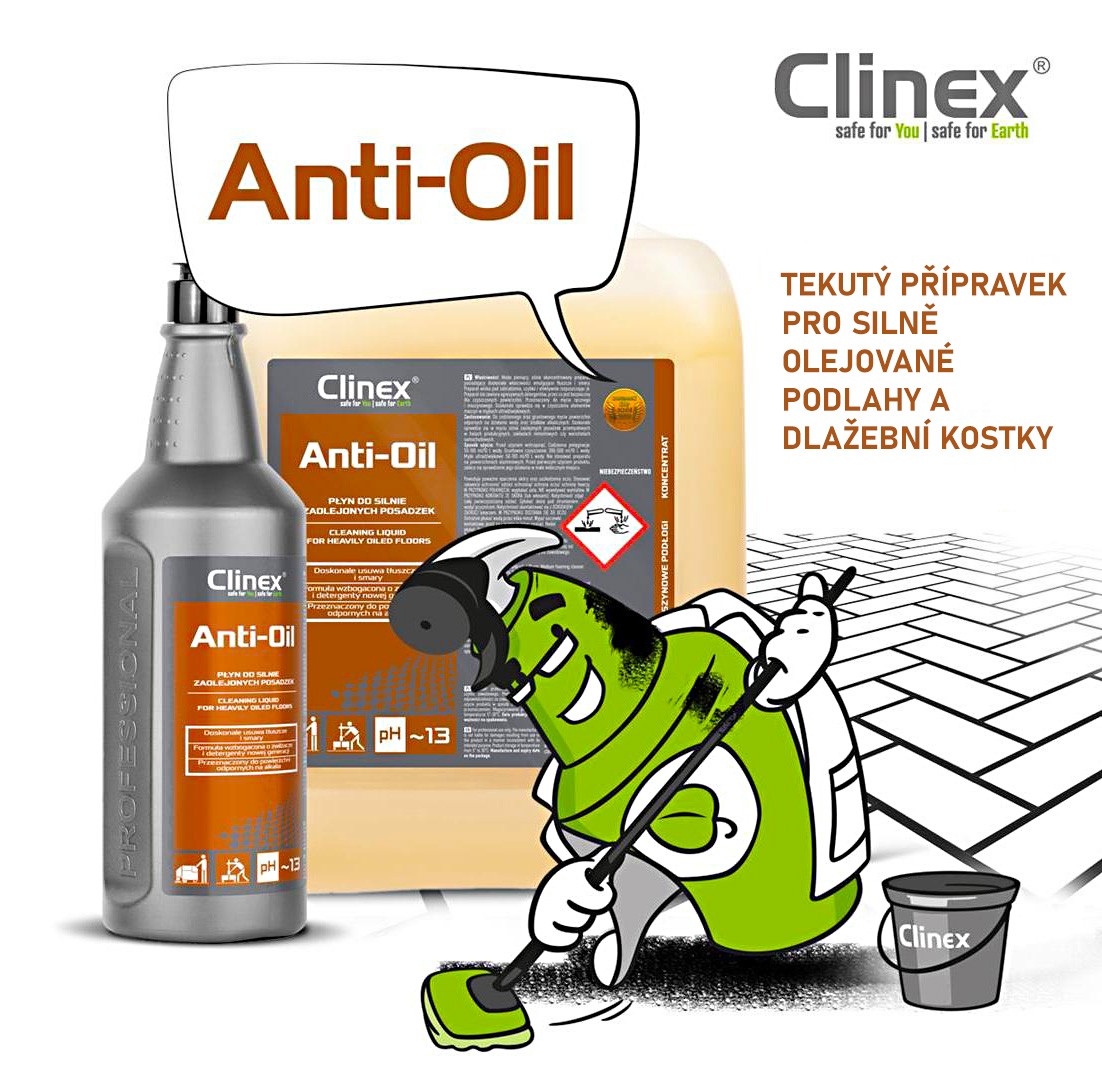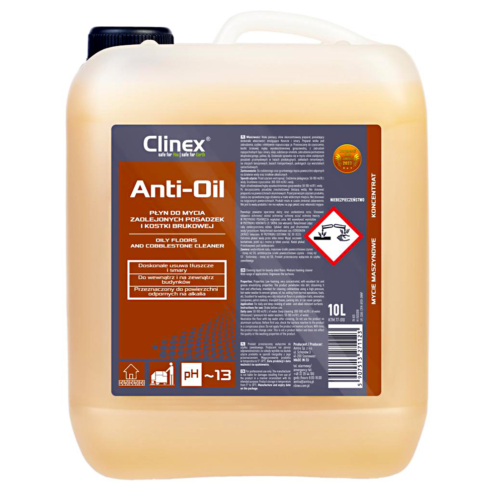 Clinex Anti-Oil je vysoce koncentrovaná a nízkopěnivá kapalina, navržená pro hloubkové čištění podlah a dlažebních kostek, které jsou silně znečištěné olejem, tukem a dalšími ropnými produkty. Tento produkt je ideální pro použití s vysokotlakými čističi s horkou vodou, kde efektivně odstraňuje mastnotu, oleje, dehet, provozní nečistoty a paliva. Clinex Anti-Oil nachází své uplatnění při čištění silně naolejovaných průmyslových podlah v provozech jako jsou výrobní haly, opravárny, čerpací stanice, dopravní depech, parkoviště a autoservisy. Jeho účinnost je nezpochybnitelná i v těch nejnáročnějších podmínkách a je nezbytný pro udržení čistoty v kotelnách na olej.
