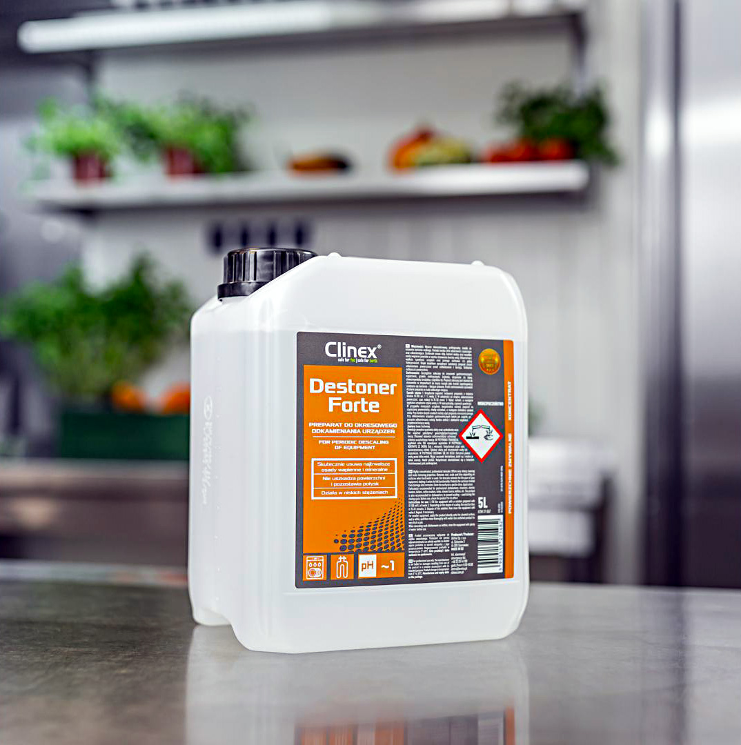 Clinex Destoner Forte je vysoce koncentrovaný profesionální odstraňovač vodního kamene. Má silné čisticí a odvápňovací vlastnosti. Dokonale odstraňuje rez, vodní kámen a veškeré usazeniny vodního kamene způsobené tvrdou vodou. Odkamňovač prodlužuje životnost spotřebičů a pomáhá udržovat jejich plnou funkčnost. Díky speciálním přísadám přípravek chrání odvápněné povrchy před poškozením a korozí. Jemně leští povrchy.
