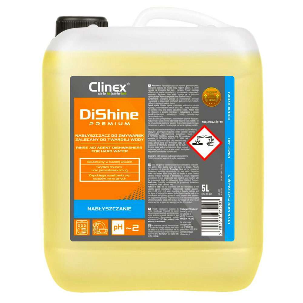 Clinex DiShine Premium je profesionální lešticí prostředek navržený pro dosažení bezchybných výsledků v komerčních myčkách nádobí. Jeho unikátní složení je ideální pro náročné provozy, jako jsou restaurace, hotely a bary, kde je vzhled nádobí klíčový pro celkový dojem. Díky němu je mytí a leštění nádobí výrazně snazší a efektivnější. Pravidelné používání Clinex DiShine Premium v kombinaci s profesionálním mycím prostředkem Clinex DishWash Premium zaručuje nádobí, které je nejen dokonale čisté, ale také oslnivě lesklé, bez jakýchkoli skvrn či šmouh. Tento bezchybný vzhled jistě ocení i ti nejnáročnější zákazníci.