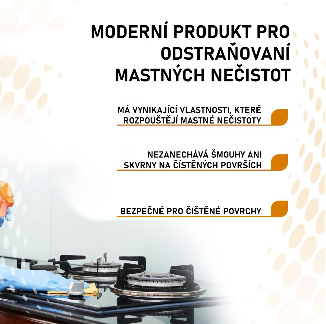 - Velmi účinný a bezpečný pro čištěné povrchy: Díky své schopnosti rozpouštět mastnotu rozpouští silné a odolné olejové a mastné skvrny, zbytky připálených jídel, aniž by na čištěných površích zanechával šmouhy nebo skvrny.