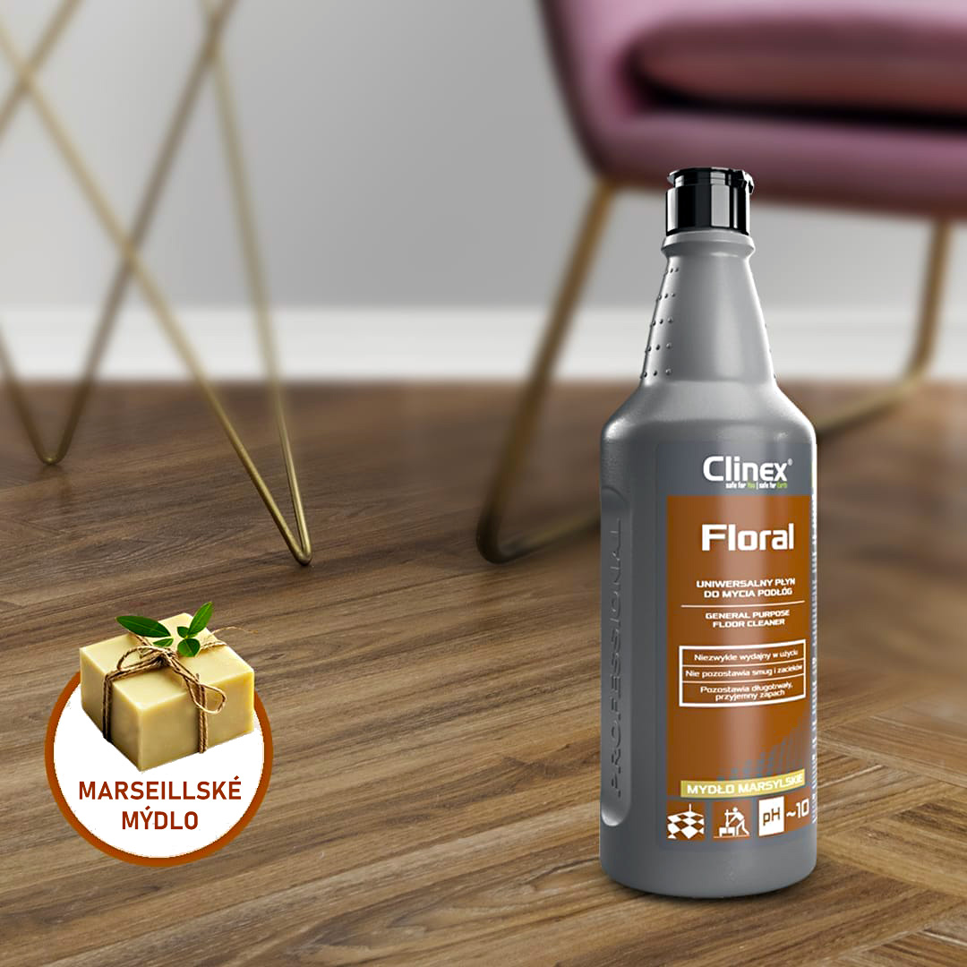 CLINEX FLORAL | MARSEILLSKÉ MÝDLO – UNIVERZÁLNÍ ČISTIČ PODLAH S CERTIFIKOVANOU KVALITOU
