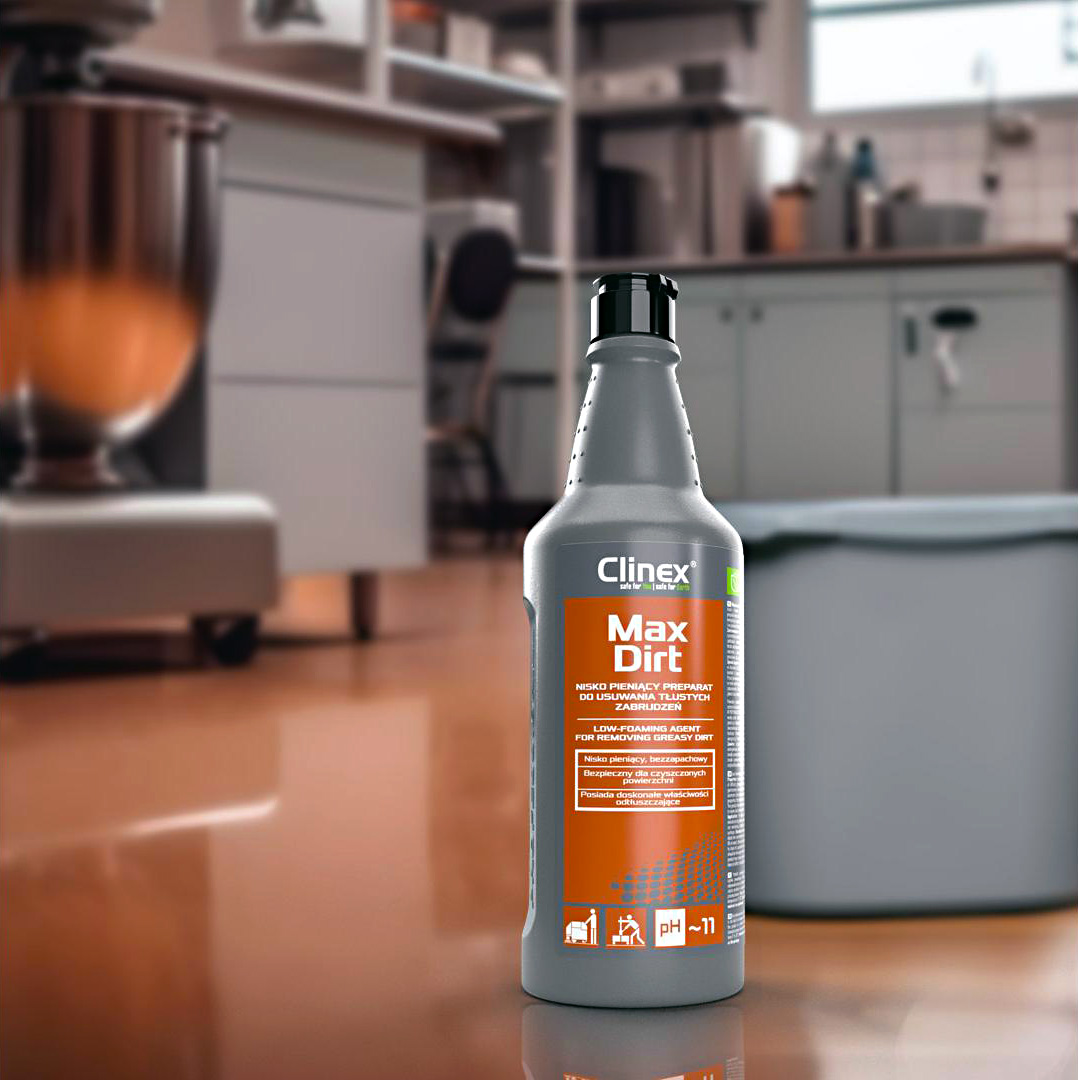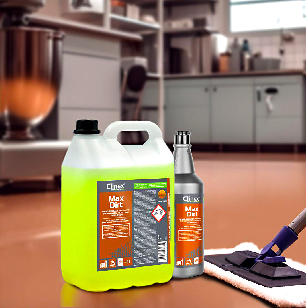 CLINEX MaxDirt je vysoce koncentrovaný, nízkopěnivý tekutý přípravek určený pro efektivní odstranění mastných a odolných nečistot z různých omyvatelných povrchů. Bez zápachu a bezpečný pro použití v potravinářských provozech, ideální pro průmyslové a gastronomické prostředí.
