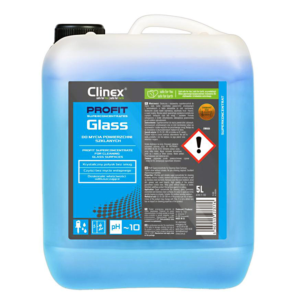 CLINEX PROFIT GLASS je vysoce účinný superkoncentrát určený k dokonalému čištění oken, zrcadel, křišťálových, smaltovaných, laminovaných povrchů a nerezové oceli. Odstraňuje i odolné nečistoty, mastnotu a stopy po hmyzu, přičemž zanechává povrchy křišťálově čisté bez šmouh a s dlouhotrvajícím antistatickým efektem.