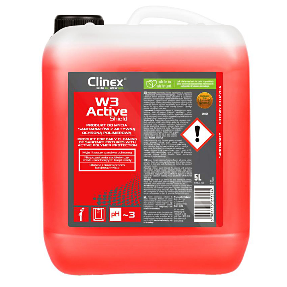 - Určení výrobku: Clinex W3 Active Shield je speciálně vyvinutý přípravek určený výhradně pro profesionální použití. Je navržen tak, aby splňoval náročné požadavky v oblasti úklidu a ochrany povrchů v komerčních a průmyslových prostředích, kde je kladen důraz na vysokou účinnost a dlouhodobou ochranu.